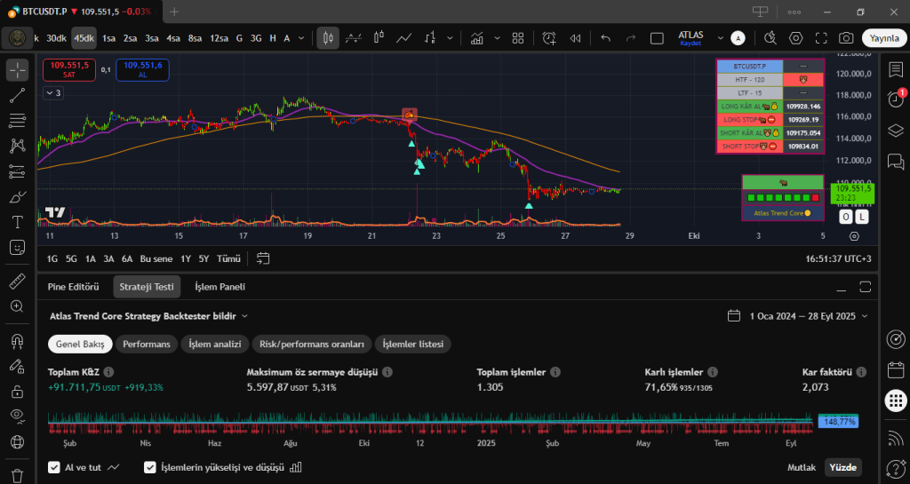 - Trade Dağılımı: 7 long pozisyon (yeşil oklar) ve 8 short (kırmızı oklar), Trend Core filtresiyle hassasiyet sağlandı. Atlas Trend Core Backtest bu dağılımı optimize eder.